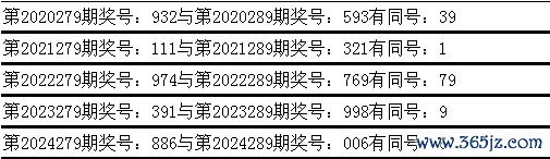与前期历史同时奖号对比分析,在最近五年开奖中,第279期同时奖号与第289期同时奖号齐出现了换取号码: